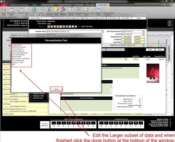 What we just looked at were green text fields that cannot be changed. Sometimes you will encounter fields in green text background that you can type directly into those fields. The fields will accept slightly over 64,000 characters of data to be typed, but are not large enough to show all that information. If you encounter a green text field that is editable, you can double click that field to gain a larger entry field box allowing you to work with a larger subset of the data in that field. Let’s take a look at the following example where we have an Order Line item (see Order Line Items) showing in a window. There are three green text fields, Special Instructions, Personalization text and line item notations. We can double click any of these fields to gain a larger entry box to work with a larger subset of the data in that field.